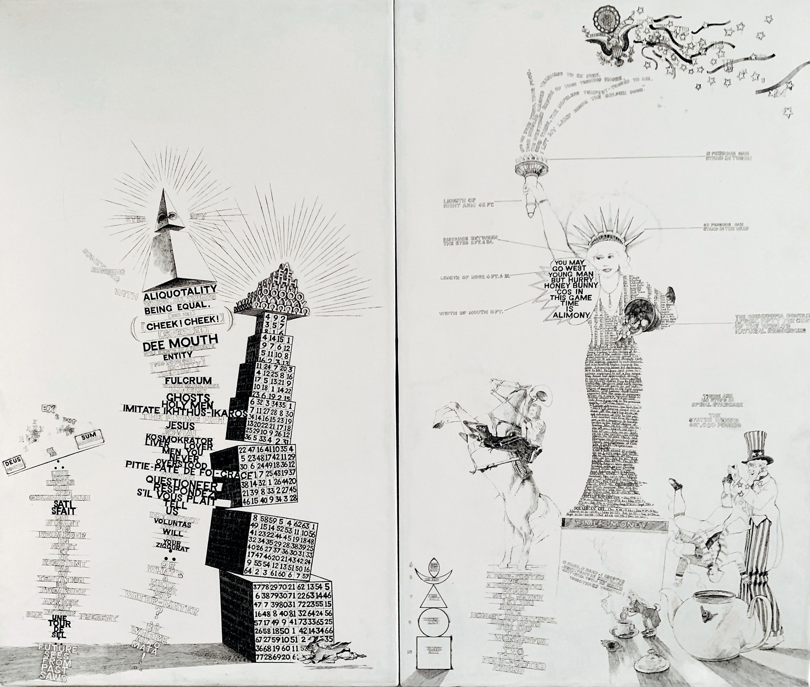 The drawing is a diptych wall panel, 3'3" high by 4' wide, executed in pen and ink in 1973. Its alternative title was America and it is a 'summary' of John's conceptual and visual 'lexicons' up to the 1970s (including towers, babel themes, and the alphabet).