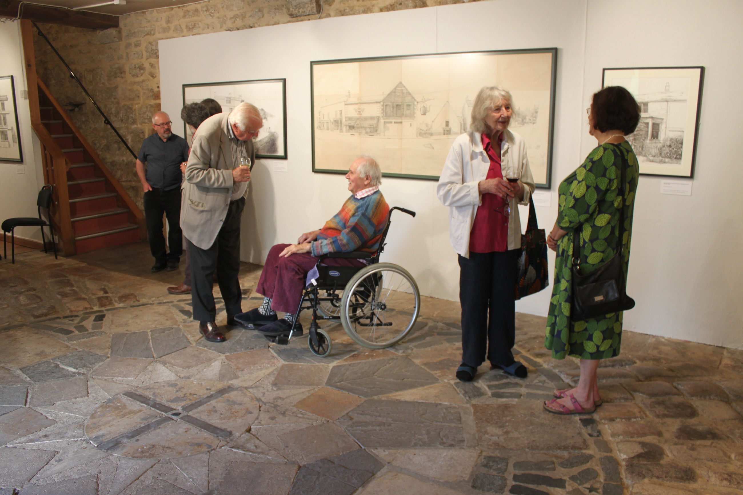 May 19th Opening of John's exhibition at Ruskin Mill (A Cotswold Celebration) After 2 days of hanging the exhibition of John's drawings relating to the Nailsworth locality where he lives, the worries about who would turn up disappear as 70 of John's friends and former colleagues at Bath School of Art appear.