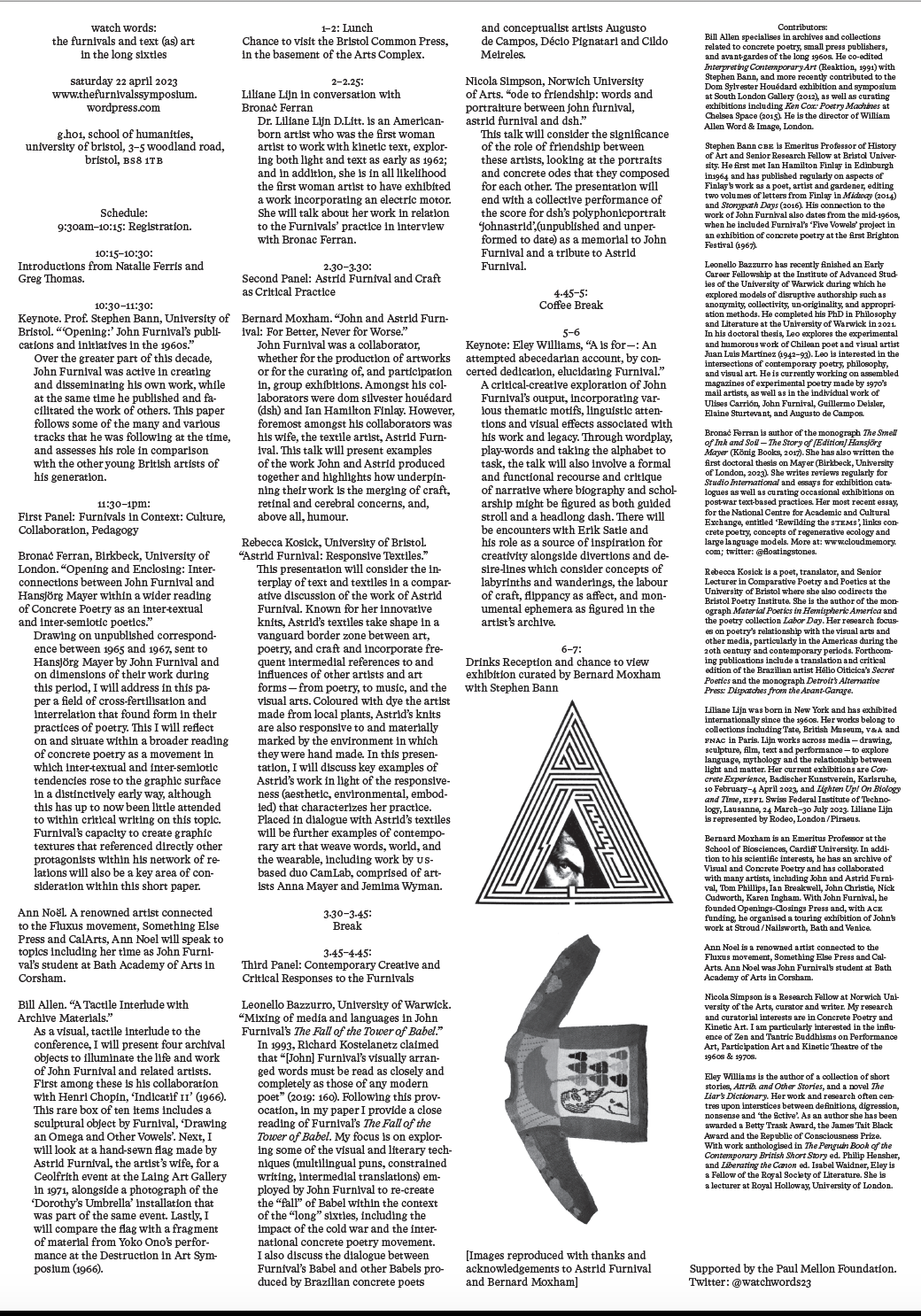 A successful symposium was held at the University of Bristol's Arts Complex on Saturday 22nd April 2023. The event was organised by Natalie Ferris and Greg Thomas as part of their 'Watch Word' endeavours. Stephen Bann and Emily Williams were keynote speakers and Stephen Bann and Bernard Moxham curated an exhibition of Furnivalia. The speakers and abstracts for the symposium are provided below: